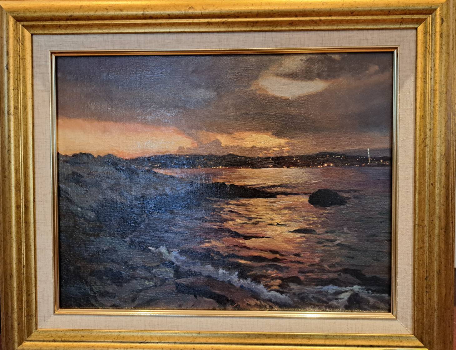 南フランスはアンチーブの優雅な夕暮れを描いた油彩画。昼間の活気と夜の静寂の狭間にある何とも言えないミステリアスな美しい時間がグラデーションとなり表現されています。 対岸に見えるのはカンヌの街並みです。灯りは太陽が沈んが後の時間も素敵になるような予感が感じられます。 南フランスの名門ホテルであるHotel Du Cap Eden Rocの裏の海岸からカンヌ方面を眺めた構図となります。 最も優雅な一枚をぜひあなたのお部屋に飾っていただきたいです。